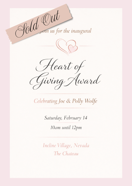 We are honored to present the inaugural Heart of Giving Award to Joe and Polly Wolfe. Joe and Polly embody what it means to care deeply for children, families, and the community they call home. Through their generosity and unwavering commitment to giving back, they inspire hope, connecting and lasting impact for many throughout the Lake Tahoe Basin. Please join us for a wonderful brunch and celebration of community, philanthropy and heart.